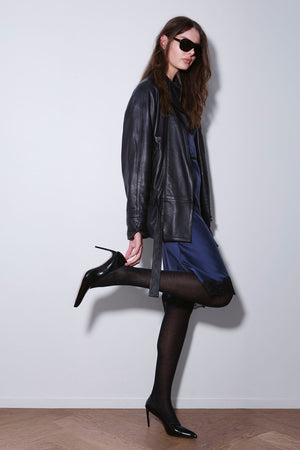 Juxtapose this with your favourite (we recommend our Knuefermann Go-To Leather Jacket in Black or Darkest brown) or Coat (we have amazing ones coming soon!) for sumptuous dinners and parties.  Made in Pure Silk Satin with lace trim at bust and hemline with a fine  black cotton ribbon to accentuate the waist, this colour will take your breath away and remains the "it" girl look for moodily lit locations.