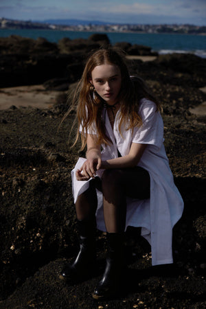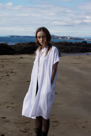 Beach or City: This oversized kneelength shirtdress in pure Linen can be worn open over togs or shorts as a poolside throw, or belted (included) for a city look for the two extremes.