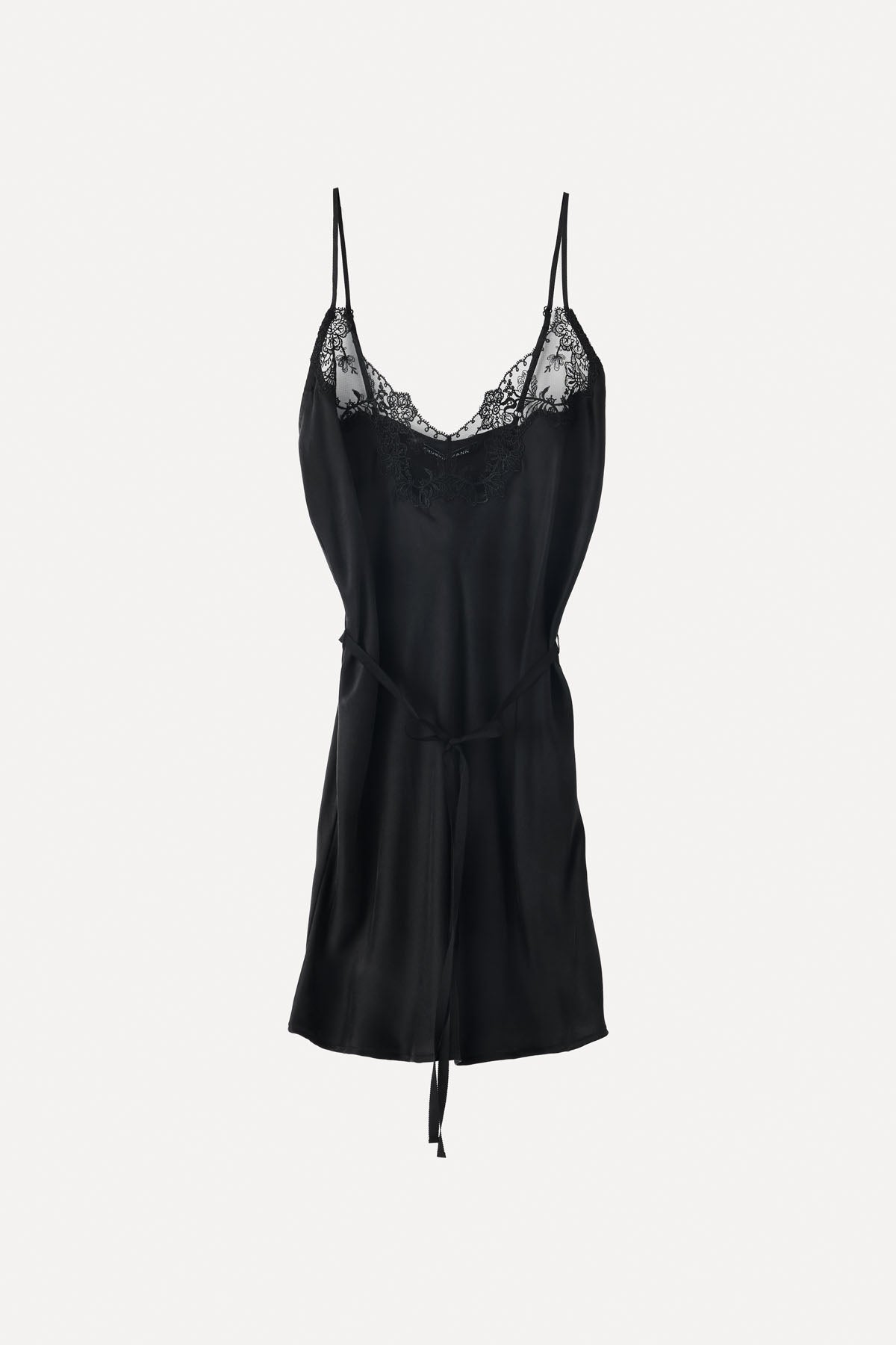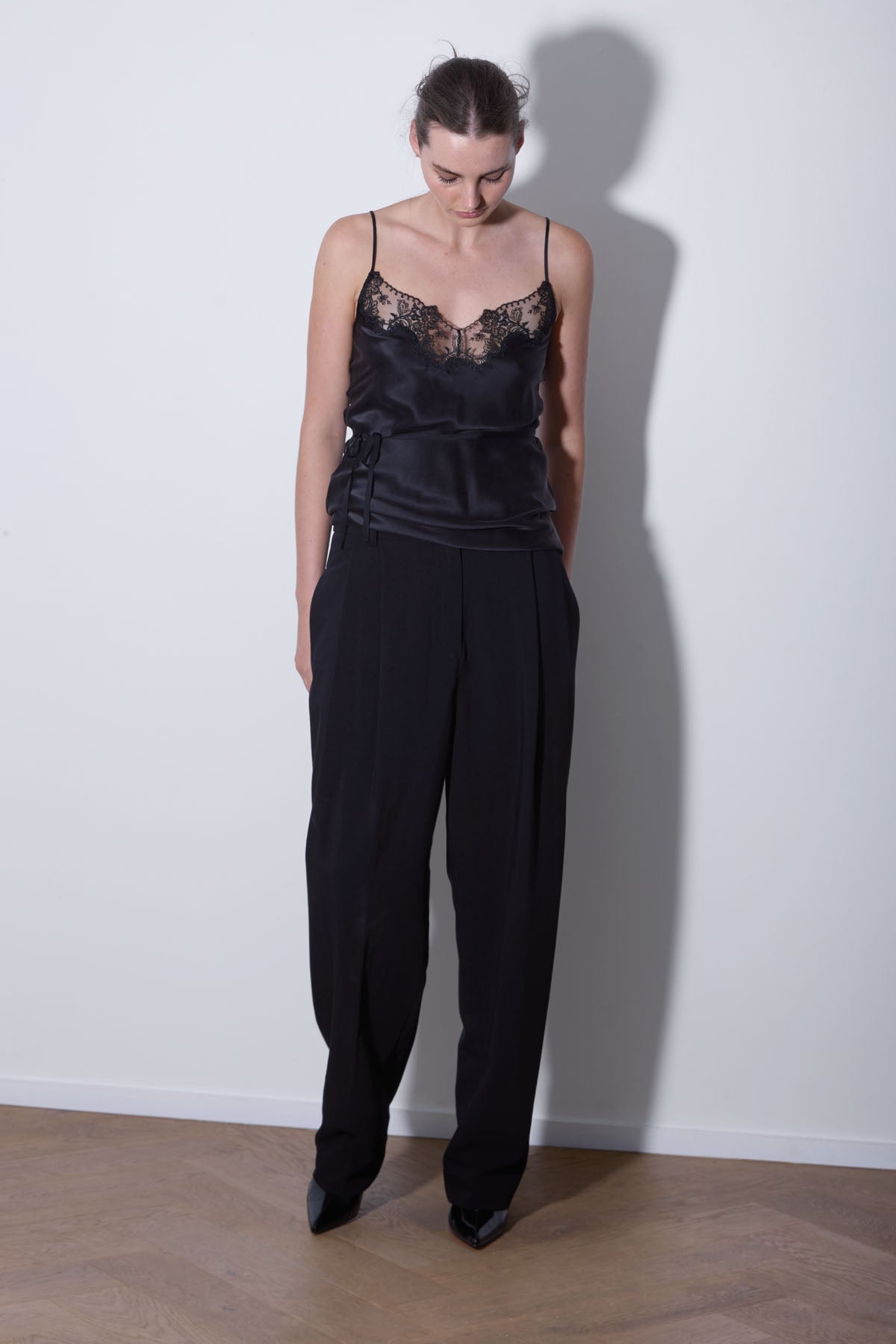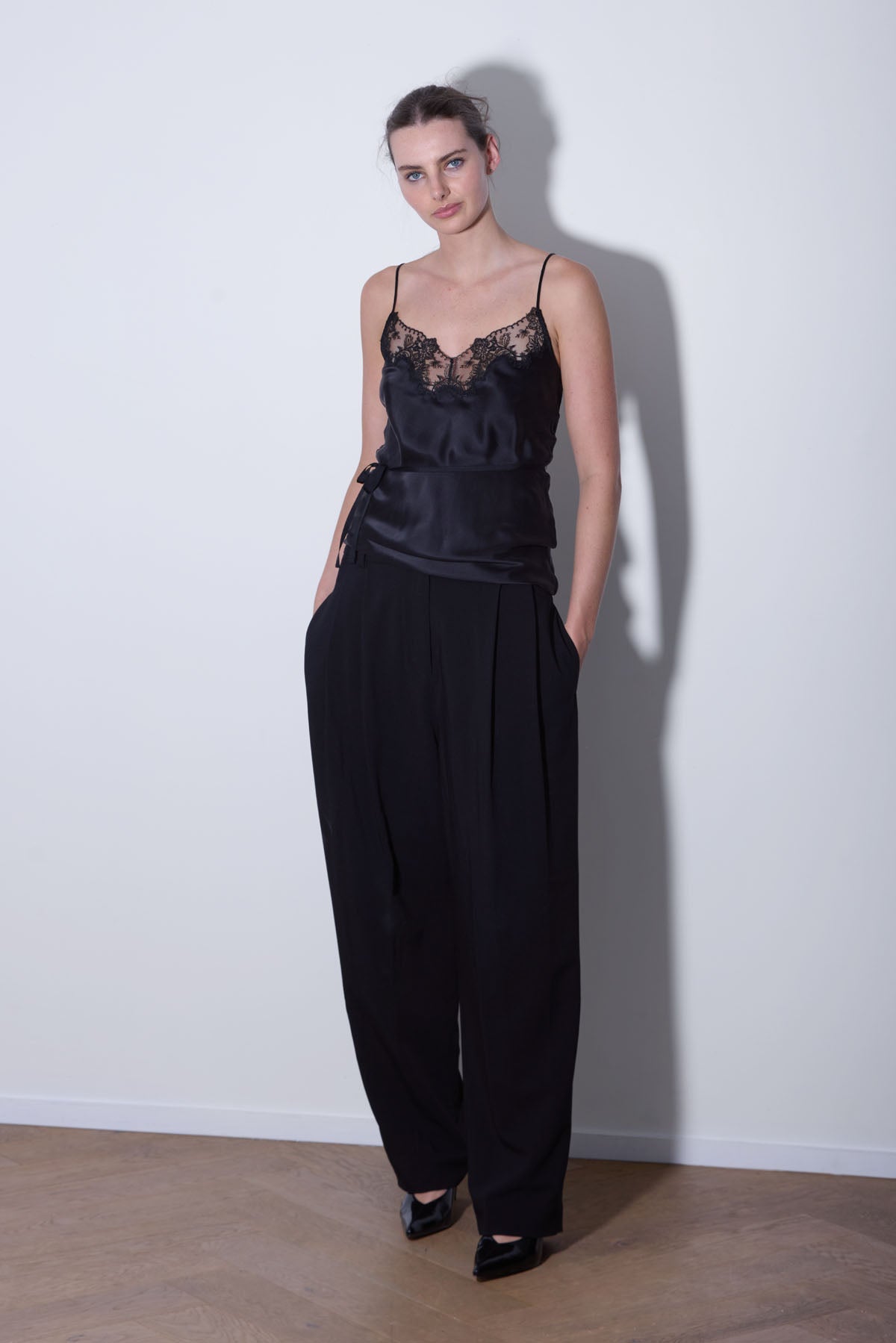 Sometimes it's the small details that make the outfit.  Sand washed silk satin with delicate lace contrast :  this sits long enough to tuck in or wear our with slightly tightened hem to naturally fold up to blouson if worn untucked.