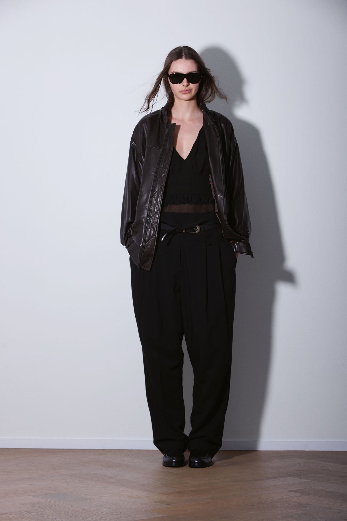 model 5’11 wears small jacket and size 13 street pant for an oversized look - she is size tk 10 in pants